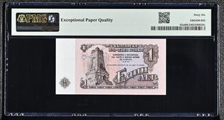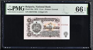 Billete de 1 Lev de Bulgaria del año 1974, certificado por PMG con una calificación de 66 EPQ. - País: Bulgaria - Año: 1974 - Denominación: 1 Lev - Calificación PMG: 66 EPQ (Gem Uncirculated) - Impresor: Goznak - Número de serie: EB473766