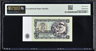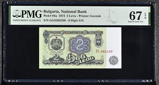 Billete de 2 Leva de Bulgaria, emitido en 1974. Certificado por PMG con una calificación de 67 EPQ. - País: Bulgaria - Año: 1974 - Denominación: 2 Leva - Calificación PMG: 67 EPQ (Superb Gem Unc.) - Pick #: 94a - Impresor: Goznak - Número de Serie: GGS565339