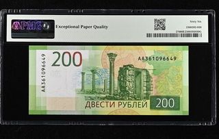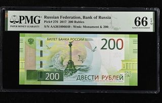 Billete de 200 rublos de la Federación Rusa, emitido en 2017. Certificado por PMG con una calificación de 66 EPQ. - Pick# 276 - S/N AA361096649 - Wmk: Monument & 200 - Grado: 66 Gem Uncirculated EPQ