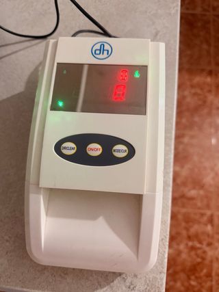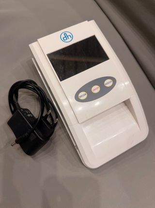 Detector de billetes de la marca DH. Incluye su cargador. - Pantalla. - Botones: DIR/CLEAR, ON/OFF, MODE/CUR. - Puerto para cargador. Detecta billetes falsos de Euro y Libra Esterlina (GBP). Utiliza múltiples modos de prueba, incluyendo código magnético, tinta magnética, infrarrojo y reconocimiento de las dimensiones del billete. Es rápido, verificando un billete en aproximadamente 0,1 segundos. Tiene una pantalla para mostrar el resultado