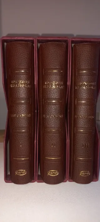 Conjunto de tres volúmenes PARDO de la colección Monedas Españolas dedicados a Juan Carlos I. Con todas las monedas de circulación. Todas SIN CIRCULAR No lleva, error del mundial, e-87 ni las de 2000 pesetas. Las de 100 pesetas lleva las dos, flor de lis arriba y abajo. Se puede enviar por correo certificado y pago por bizum - Tomo I - Tomo II - Tomo III - Encuadernación en piel marrón con detalles dorados. - Incluye el logo de pardo en cada volumen.