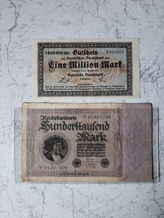 Conjunto 2 billetes alemanes 1923 y 3 Rumania