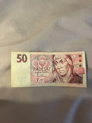 Billete de 50 coronas checas emitido en 1997. - Diseño con retrato de Santa Inés de Bohemia. - Denominación: 50 KORUN ČESKÝCH. - Emitido por el Banco Nacional Checo.
