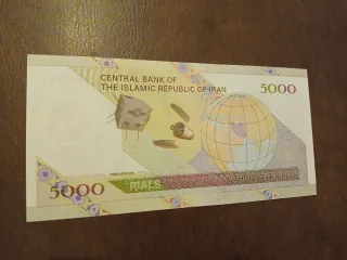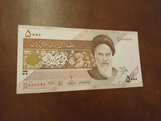 Billete de 5000 riales de Irán. Presenta un retrato de Ruhollah Jomeini. - Denominación: 5000 riales. - País: Irán. - Idioma: Persa.