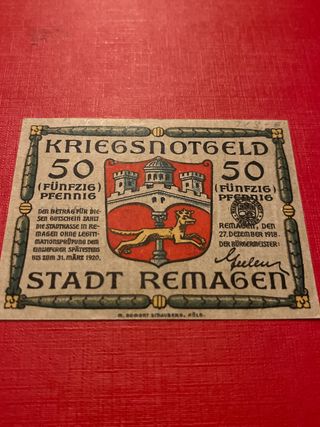 Billete de Kriegsgeld (dinero de guerra) de la ciudad de Remagen. - Valor: 50 Pfennig. - Fecha: 27 de diciembre de 1918. - Emitido por la Stadt Remagen. - Impreso por M. Dumont Schauberg, Köln.