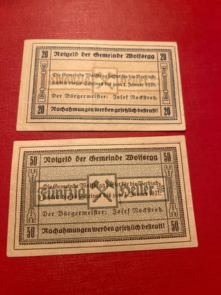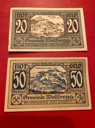 2 Billetes Notgeld Austria Wolfsegg 20 y 50 Heller