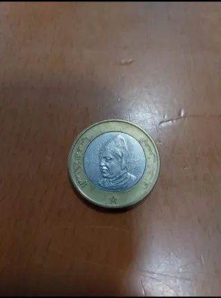 Moneda de 10 dirhams de Marruecos con fecha de 1995. - Diseño con retrato. - Bimetálica.