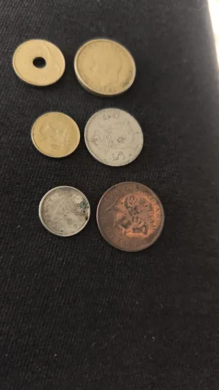 Conjunto de varias monedas antiguas de diferentes países y épocas. - Moneda con agujero central. - Moneda con perfil de rey. - Moneda con escudo. - Moneda con figura de mujer. - Moneda de Gibraltar con fecha 2005.
