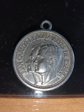 Llavero con moneda conmemorativa de Juan Carlos I y Sofía de Grecia. - Diseño de doble perfil. - Inscripción JUAN CARLOS I SOFIA REYES DE ESPAÑA.