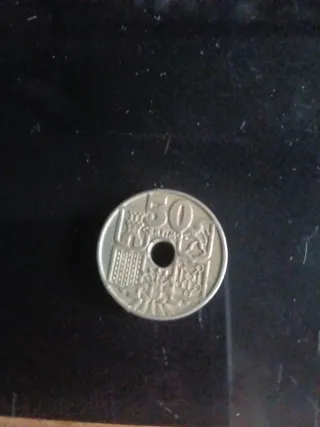 Moneda de 50 céntimos de España con fecha de 1949. - Diseño con agujero central. - Inscripción ESPAÑA y año 1949.