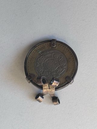 Moneda mexicana de 10 pesos, con un diseño clásico y un colgante metálico. - Moneda de 10 pesos mexicanos. - Montura metálica para usar como colgante.