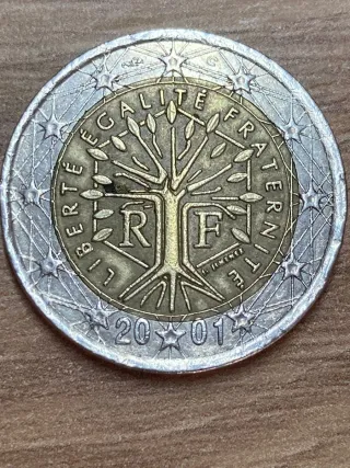 Moneda de 2 euros de Francia con el diseño del Árbol de la Vida. - Año de acuñación: 2001. - Diseño: Árbol de la Vida. - Inscripción: Liberté Égalité Fraternité.