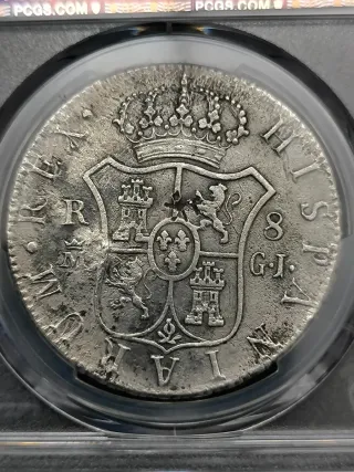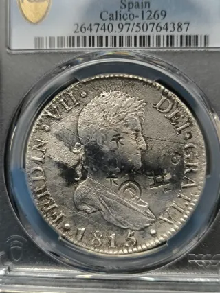 Moneda de 8 Reales de Fernando VII acuñada en Madrid en 1815. - Año: 1815 - Ceca: Madrid (M) - Ensayadores: G J - Encapsulada y certificada por PCGS - Detalles VF 97 Daños ambientales - Con RESELLOS - 27 gr