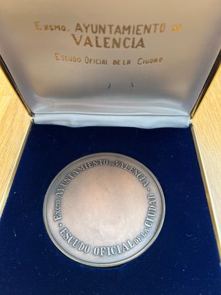 Magnífica medalla oficial del Excmo. Ayuntamiento de Valencia, presentada en su estuche original de lujo con serigrafía dorada. Anverso: Escudo oficial de la ciudad de Valencia con todo lujo de detalles (el murciélago o rat penat, las "L" de lealtad y la corona real). Reverso: Inscripción "Excmo. Ayuntamiento de Valencia - Escudo Oficial de la Ciudad". Material: Bronce con una pátina natural excelente, sin limpiezas agresivas que dañen su valor histórico.