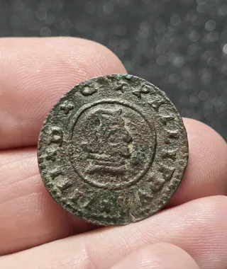 Moneda de Felipe IV acuñada en el año 1663. - Denominación: 16 maravedís. - Periodo de reinado: 1621-1665.