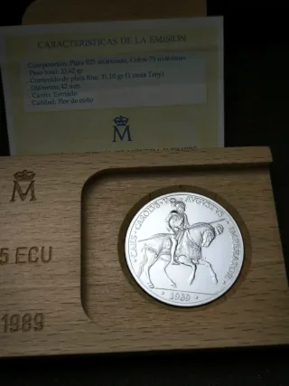 Moneda de 5 ECU de España, acuñada en 1989. Pieza de colección. - Composición: Plata 925 milésimas, Cobre 75 milésimas. - Peso total: 33,62 gr. - Contenido de plata fina: 31,10 gr (1 onza Troy). - Diámetro: 42 mm. - Canto: Estriado. - Calidad: Flor de cuño.