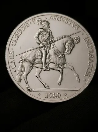 Cincuentin conmemorativo del Quinto Centenario de 1989. - Diseño con retratos de la familia real. - 168 gr plata 925 - 5 Oz. de Plata Pura - Año de acuñación: 1989. - En capsula, caja y cartón ( sin certificado)