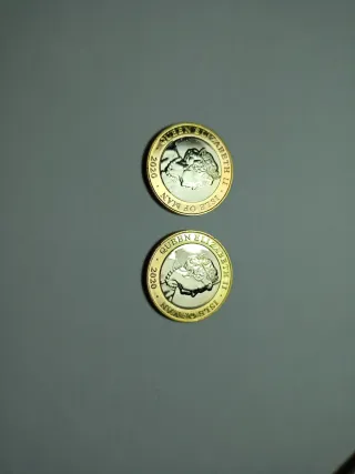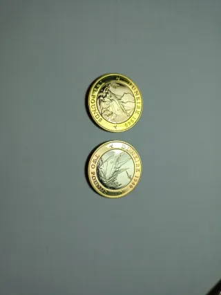Dos unidades de 50 peniques de Gibraltar conmemorativas del año 2025. Estas monedas presentan un diseño detallado. - Moneda de 50 peniques. - Emisión de Gibraltar. - Año 2025.