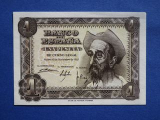 Billete del Banco de España con valor de 1 peseta, sin Circular, emitido en 1951. (B) - Diseño con retrato. - Fecha de emisión: 19 de Noviembre de 1951. - Firmas de El Gobernador, El Interventor y El Cajero. - Compra mínima para envío 5€.