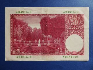 Billete de 50 pesetas con fecha de 31 de diciembre de 1951, circulado pero en aceptable estado de conservación, serie A (en negro), medidas 135 x 86 mm, anverso pintor Santiago Rusiñol, reverso cuadro Jardines de Aranjuez, filigrana, puesto en circulación el 17 de febrero de 1956. - Número de serie: A0481579. - Circulado.