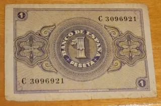 Billete de 1 peseta del Banco de España, correspondiente a la época franquista. - Serie C. - Número de serie: 3096921. - Diseño con el número 1 en el centro y Banco de España Peseta en círculo.