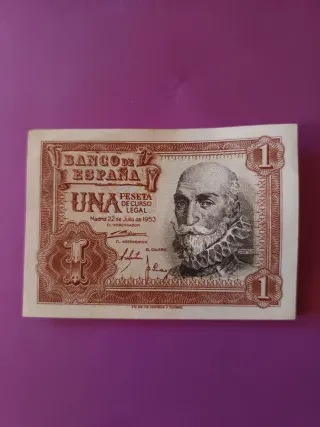 Billete de 1 peseta del Banco de España, emitido en 1953. Sin Circular. (B) - Denominación: Una Peseta. - Fecha de emisión: 22 de Julio de 1953. - Lugar de emisión: Madrid. - Diseño con retrato. - Firma del Gobernador e Interventor.