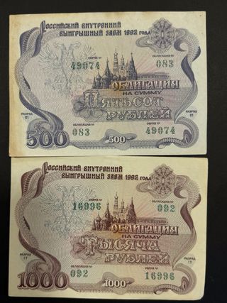 2 Billetes Rusos 500 y 1000 Rublos 1992