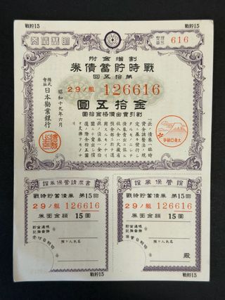 Certificado de bono de ahorro de guerra japonés de 1944, emitido por el Banco de Fomento de Japón. - Serie: 15 - Número de grupo: 29 - Número de serie: 126616 - Valor nominal: 15 yenes NUFILART bonos billetes Japón Asia BJ AP 50