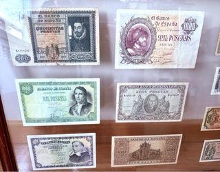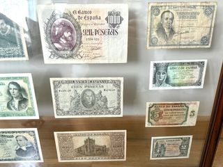 Colección de billetes antiguos españoles en un marco. Ideal para coleccionistas. - Valorado en mas de 2.000€ por profesional pero no queremos abrir el marco así que se vende por ese precio. - Incluye billetes de 1938, 43, 40, 46, 49... - Marco de madera y cristal