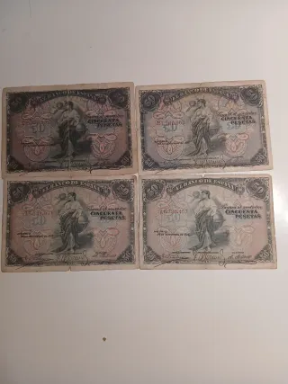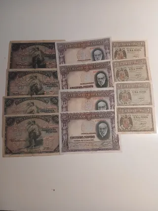 Conjunto de 12 billetes españoles. - cuatro billetes de 50 pesetas del 24 de Septiembre de 1906. - cuatro billetes de 50 pesetas 22 de Julio 1935. - cuatro billetes de 1 Peseta del 30 Abril de 1938. Billetes curiosos, son los de las fotos. Entrega en mano en Madrid. Posibilidad de envio certificado. Seriedad absoluta.