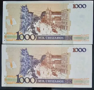 Billete de 1000 Cruzeiros de Brasil, emitido en 1990. Presenta el retrato de Machado de Assis. UNC y EBC - Serie B 0772043232 A - Serie A 4845024067 A