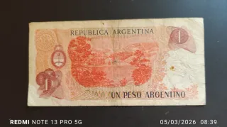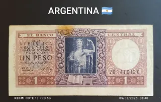 Billete de 1 Peso de la República Argentina. - El Banco Central de la República Argentina Pagará al Portador y a la Vista Un Peso Moneda Nacional. - Número de serie: 76.141.012 C. - Diseño con figura femenina sosteniendo una balanza.
