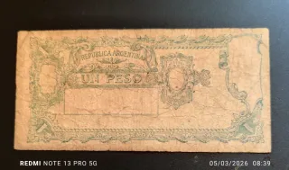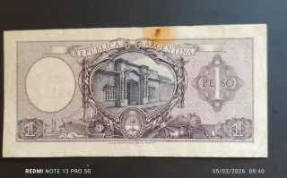 Billete de 1 Peso Argentino del Banco Central de la República Argentina. - Diseño con figura alegórica de la Justicia. - Número de serie: 58.441.996 A. - Moneda Nacional.