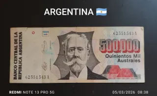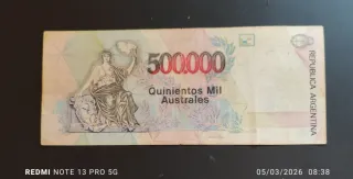 Billete de 500.000 Australes de la República Argentina. El billete muestra el retrato de Manuel Quintana. - Banco Central de la República Argentina. - Serie 62.551.543 A. - Quinientos Mil Australes.