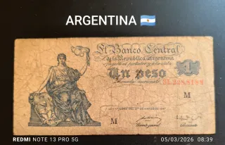Billete de El Banco Central de la República Argentina con valor de 1 peso moneda nacional. Emitido en 1947. - Ley N° 12962 del 27 de Marzo de 1947. - Serie M. - Firma del Gerente General y Presidente.