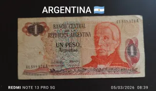 Billete de colección de 1 Peso Argentino. - Banco Central de la República Argentina. - Diseño con retrato de Gral. San Martín. - Número de serie: 41.889.874A.