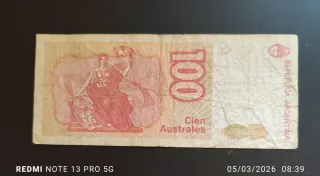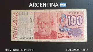 Billete de 100 Australes de la República Argentina. El billete muestra el retrato de Domingo F. Sarmiento. - Banco Central de la República Argentina. - Serie 01.584.184 D.