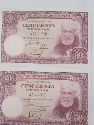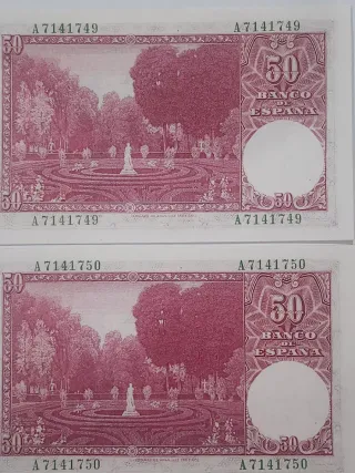 Dos billetes de 50 pesetas españoles para coleccionistas. Pareja correlativa SC - Serie A7141749 y A7141750. - Diseño con jardín y estatua. - Banco de España.
