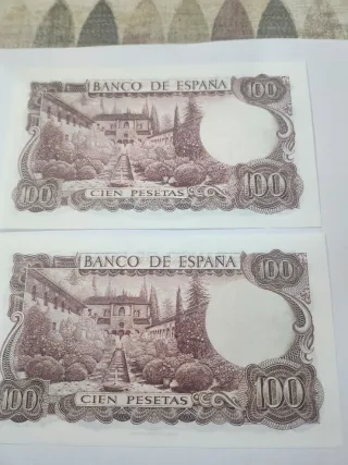 Dos billetes de 100 pesetas del Banco de España. Pareja correlativa serie 9A - Serie 9A5305838 y 9A5305839. - Fecha: 17 de noviembre de 1970. - Diseño con retrato de hombre y detalles ornamentales.