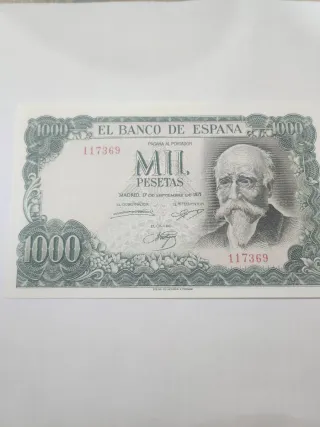 Billete de colección del Banco de España. SIN SERIE - Valor: 1000 Pesetas. - Fecha: 17 de Septiembre de 1971. - Serie: 117369. - Diseño con retrato de personaje histórico.