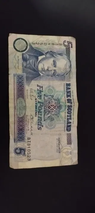 Billete de 5 libras esterlinas del Banco de Escocia, emitido en 2002. Presenta un retrato de Sir Walter Scott. - Serie BT810523. - Fecha de emisión: 25 de junio de 2002. - Conmemoración de 300 años de servicio a la comunidad (1695-1995).