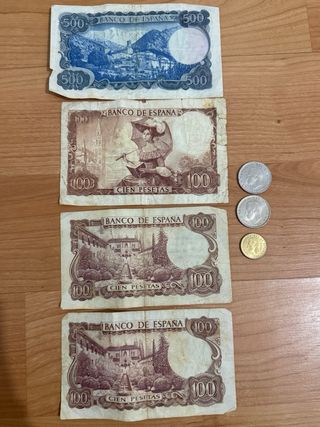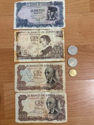 Conjunto de billetes y monedas antiguas de Pesetas españolas. - Un billete de 500 Pesetas de 1971 (Jacinto Verdaguer) - Un billete de 100 Pesetas de 1965 (Gustavo Adolfo Becquer) - Dos billetes de 100 Pesetas de 1970 (Manuel De Falla) - Una moneda de 25 Pesetas de 1982 (Juan Carlos I) - Una moneda de 1 Peseta de 1980 (Juan Carlos I)