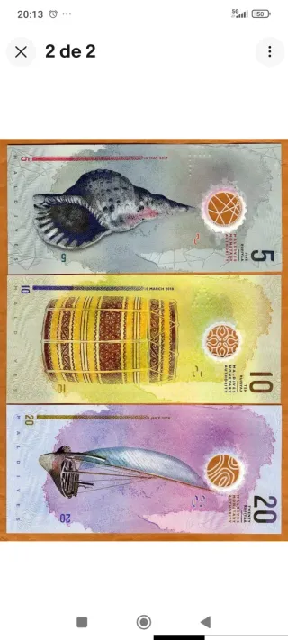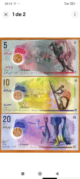 3 Billetes Maldivas 5, 10, 20 Rufiyaa Polímero