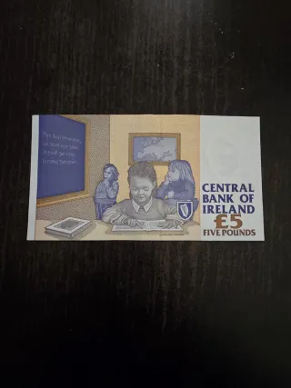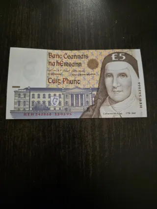 Billete de 5 libras irlandesas con la imagen de Catherine McAuley. - Denominación: £5 - Serie: HEH 542865 - Año de emisión: 130195 - Retrato: Catherine McAuley (1778-1841) - Texto: Banc Ceannais na hÉireann, Cuig Phunt