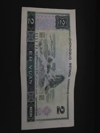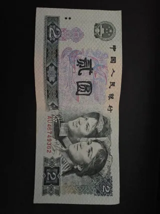 Billete de 2 Yuan de la República Popular China. Presenta un diseño detallado con retratos y símbolos. - Denominación: 2 Yuan. - País: República Popular China. - Serie: AU46749362.