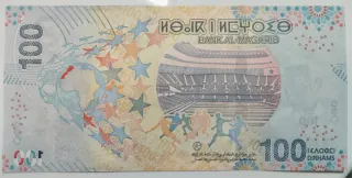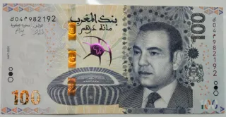 Billete de 100 Dirham de Marruecos, emitido en 2025. - Diseño con retrato del Rey Mohammed VI. - Incluye el escudo de Marruecos. - Motivos arquitectónicos y geográficos.
