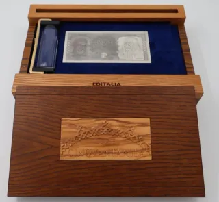 billete de 50.000 liras de Leonardo Da Vinci en plata 999, de 347 gramos de peso y 2 mm de grosor, completo con caja de madera y certificado