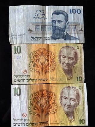 Lote de 3 billetes antiguos de Israel. Incluye billete de 100 liras de 1973 con Theodor Herzl y dos billetes de 10 New Sheqalim con retrato de Golda Meir. Piezas auténticas del Bank of Israel. Billetes circulados con marcas de uso y dobleces visibles (ver fotos). Interesantes para coleccionistas de numismática o billetes internacionales. notafilia, banknotes collection, paper money collection, banknote vintage, billete descatalogado, billete extranjero antiguo, billete numismático, billete histórico, banknote collector, billetes siglo XX, banknotes lot, world banknotes, collectible banknotes, vintage. Diseños históricos de Israel.