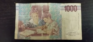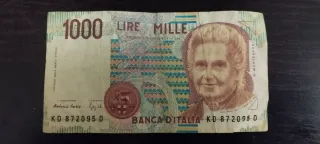 Billete de 1.000 liras italianas, emitido por el Banco de Italia. - Serie: KD 872095 D - Ilustra a Maria Montessori - Reverso con el León de San Marcos de Venecia