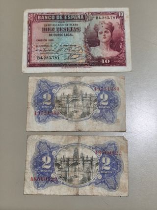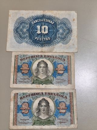 - Un billete de 10 pesetas del Banco de España, emisión 1935. - Dos billetes de 2 pesetas, con diseño de puente y valor. - Los billetes muestran signos de uso y paso del tiempo.